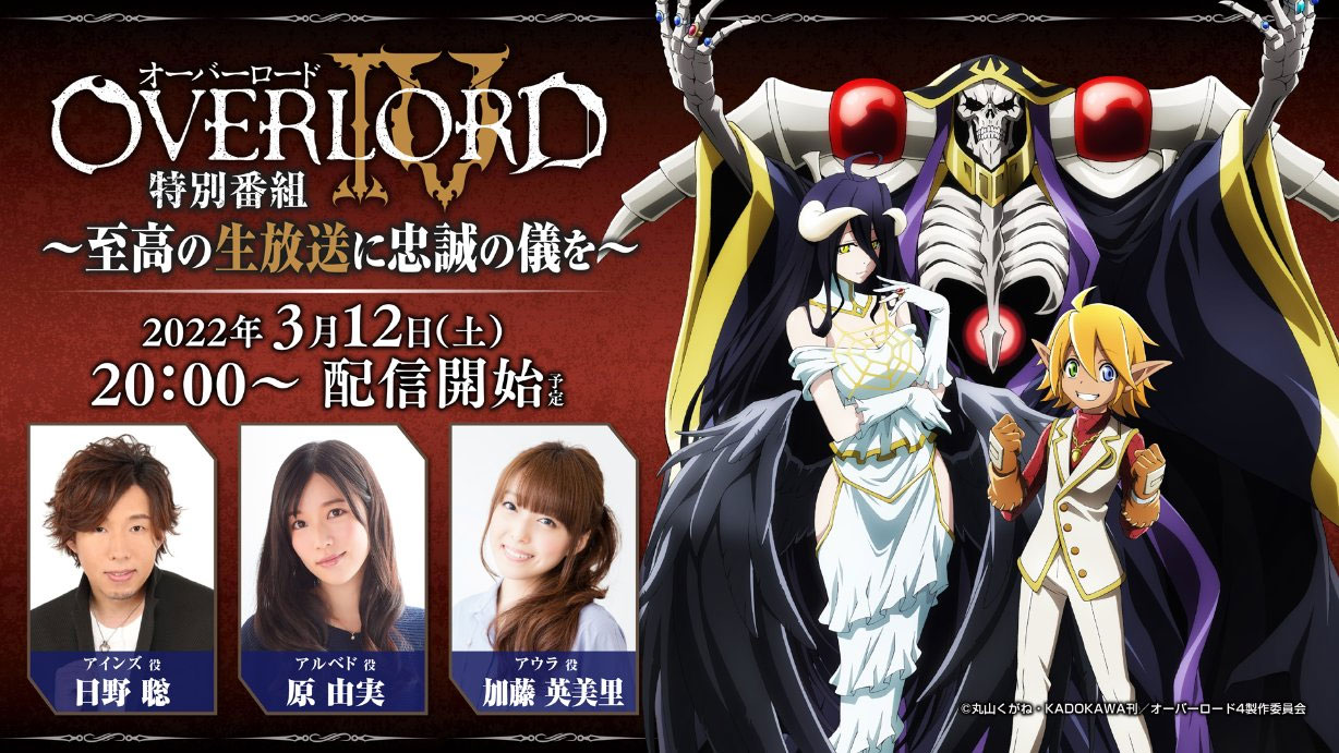 Según un reporte realizado por el comité de producción para la adaptación al anime de la novela ligera Overlord, se anunció que el próximo 12 de marzo se llevará a cabo una transmisión especial en el que se darán a conocer nuevos detalles de la cuarta temporada de la serie. Por el momento, solo se sabe que un nuevo vídeo promocional será revelado en este evento.