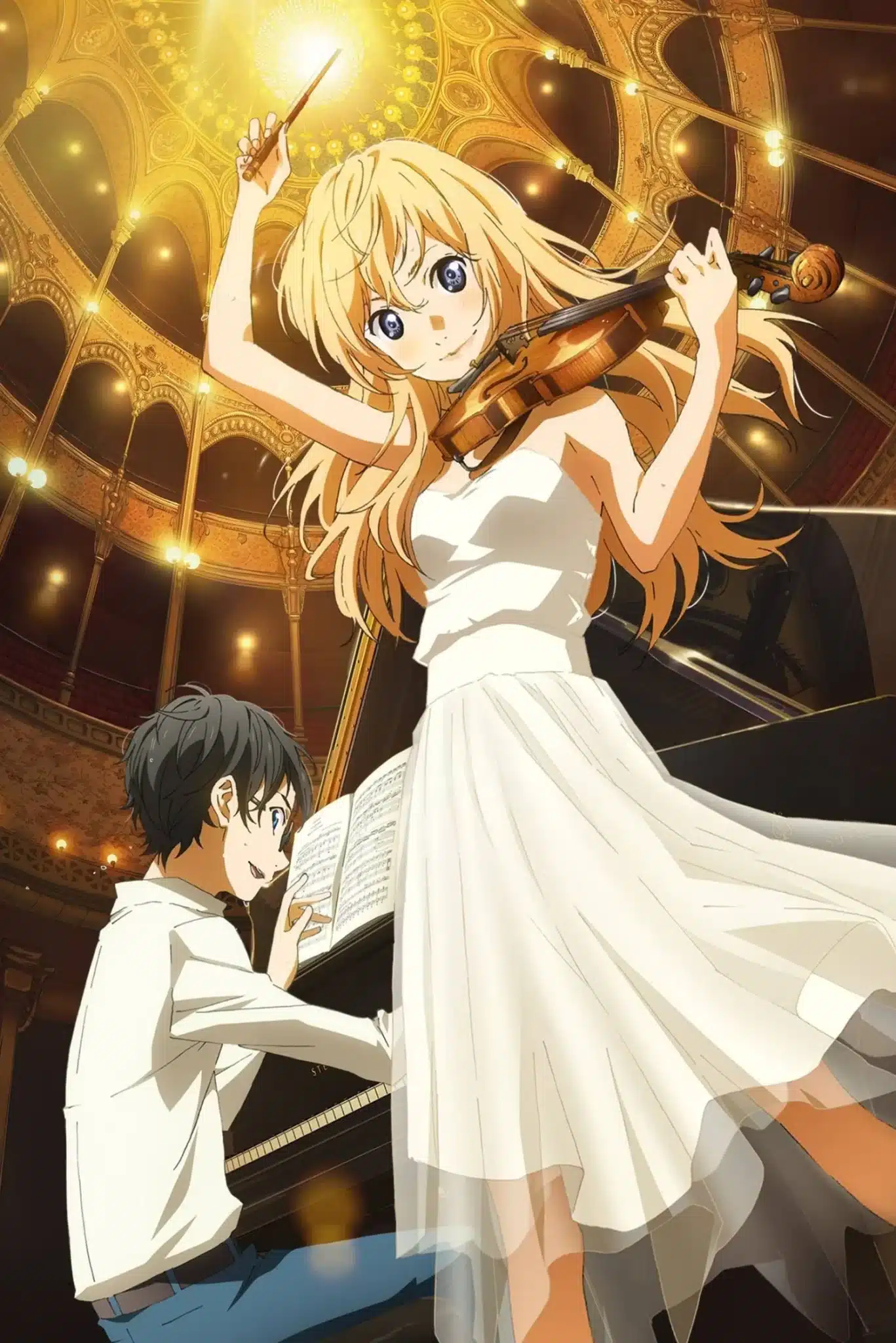 El anime Shigatsu wa Kimi no Uso cuenta con la siguiente descripción: Kousei Arima es un chico prodigio conocido como el «Metrónomo Humano» por tocar el piano con precisión y perfección. Guiado por una madre estricta y un riguroso entrenamiento, Kousei domina todas las competiciones a las que se presenta, ganándose la admiración de sus compañeros músicos y los elogios del público. Cuando su madre fallece repentinamente, el trauma subsiguiente le incapacita para oír el sonido de un piano, y a partir de entonces nunca vuelve a subir al escenario.