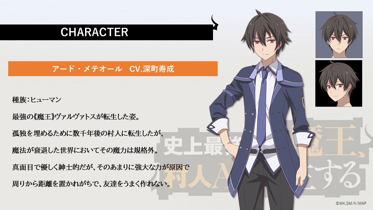 Además, el sitio web oficial del anime Shijou Saikyou no Daimaou, Murabito A ni Tensei Suru también presentó a los miembros principales del elenco de voz, diseños de personajes, miembros principales del staff, y publicó la primera imagen promocional de la serie.