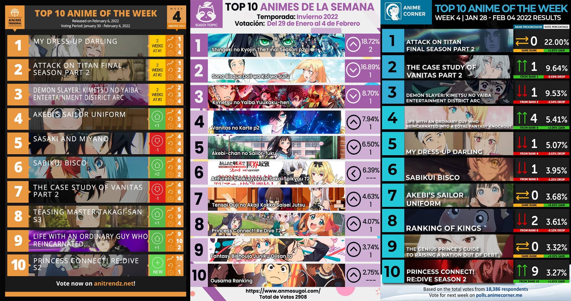 En estas últimas semanas, el anime Shingeki no Kyojin estuvo ganando un gran reconocimiento en la opinión de internet y también en la opinión de los fanáticos del anime, llegando a posicionarse en posiciones top en diferentes rankings semanales de diferentes medios como Anime Corner, Anime Trending y en nuestras propias votaciones semanales (Sugoi Topic).