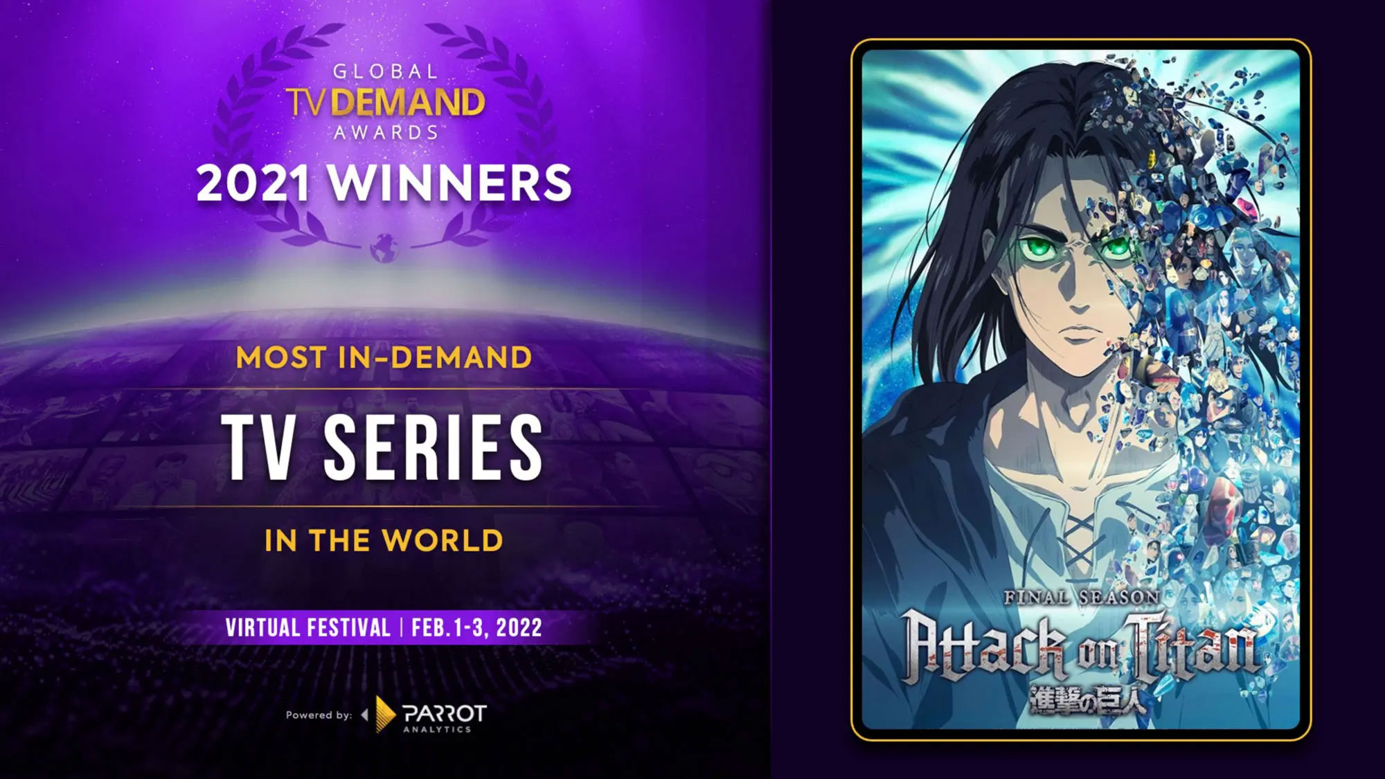 En la historia del día de hoy, el anime Shingeki no Kyojin obtuvo un nuevo logro, y no, esta vez no provoco la caída de alguna plataforma, sino que en esta ocasión, la firma de investigación de mercado «Parrot Analytics» le otorgó el premio de los «Global TV Demand Awards» al anime Shingeki no Kyojin, siendo la serie más solicitada del mundo de 2021.