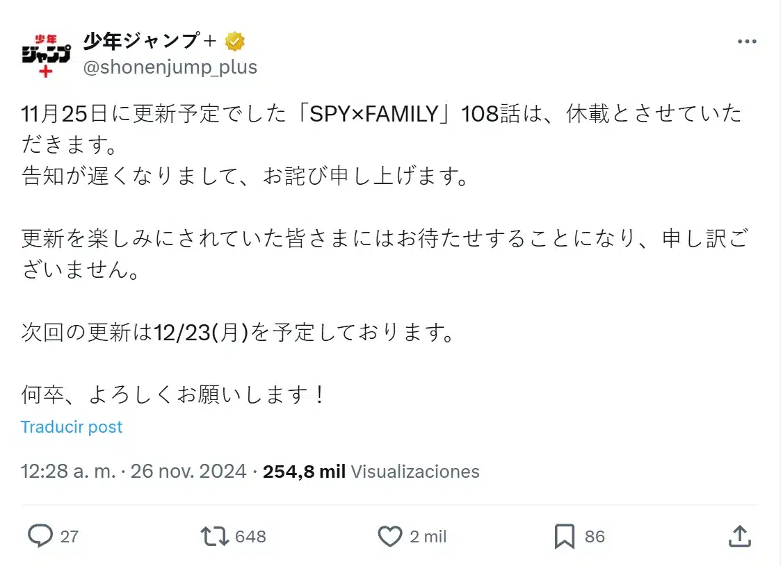 El capítulo 108 de SPY×FAMILY, que estaba programado para publicarse el 25 de noviembre, será cancelado. Pedimos disculpas por la demora en anunciar esta decisión. Lamentamos hacer esperar a todos aquellos que estaban esperando con entusiasmo el capítulo. La próxima actualización está programada revelarse el lunes 23 de diciembre. Les agradecemos su comprensión.
