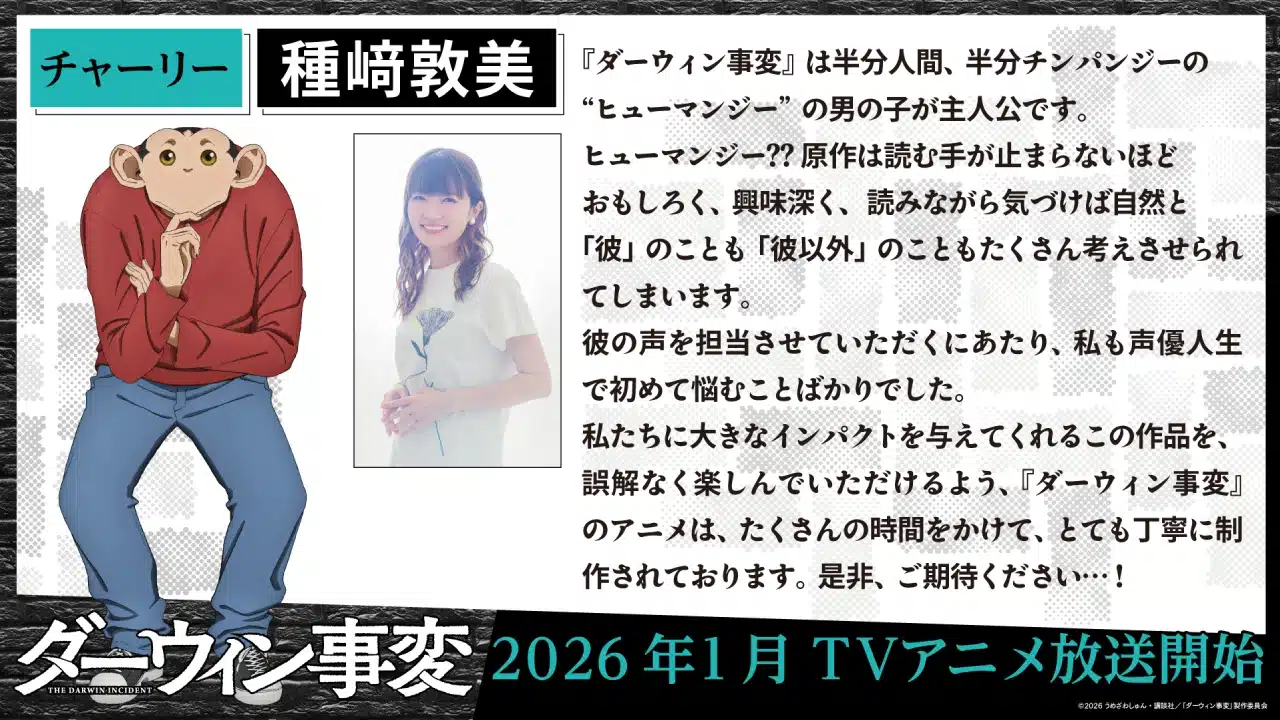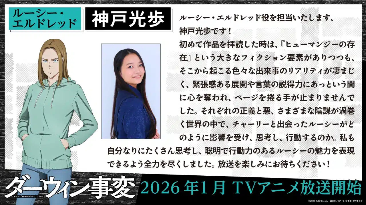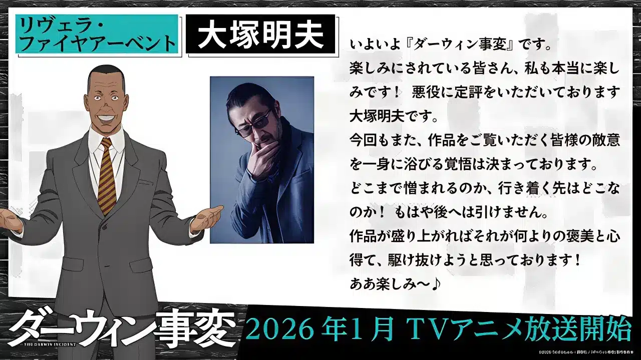 Los respectivos medios oficiales para la adaptación al anime del manga The Darwin Incident (Darwin Jihen) se ha presentado al público un nuevo vídeo promocional para la serie, así como también una nueva imagen visual. Además, el vídeo presenta a los primeros integrantes del elenco de voz que participaran en el anime.