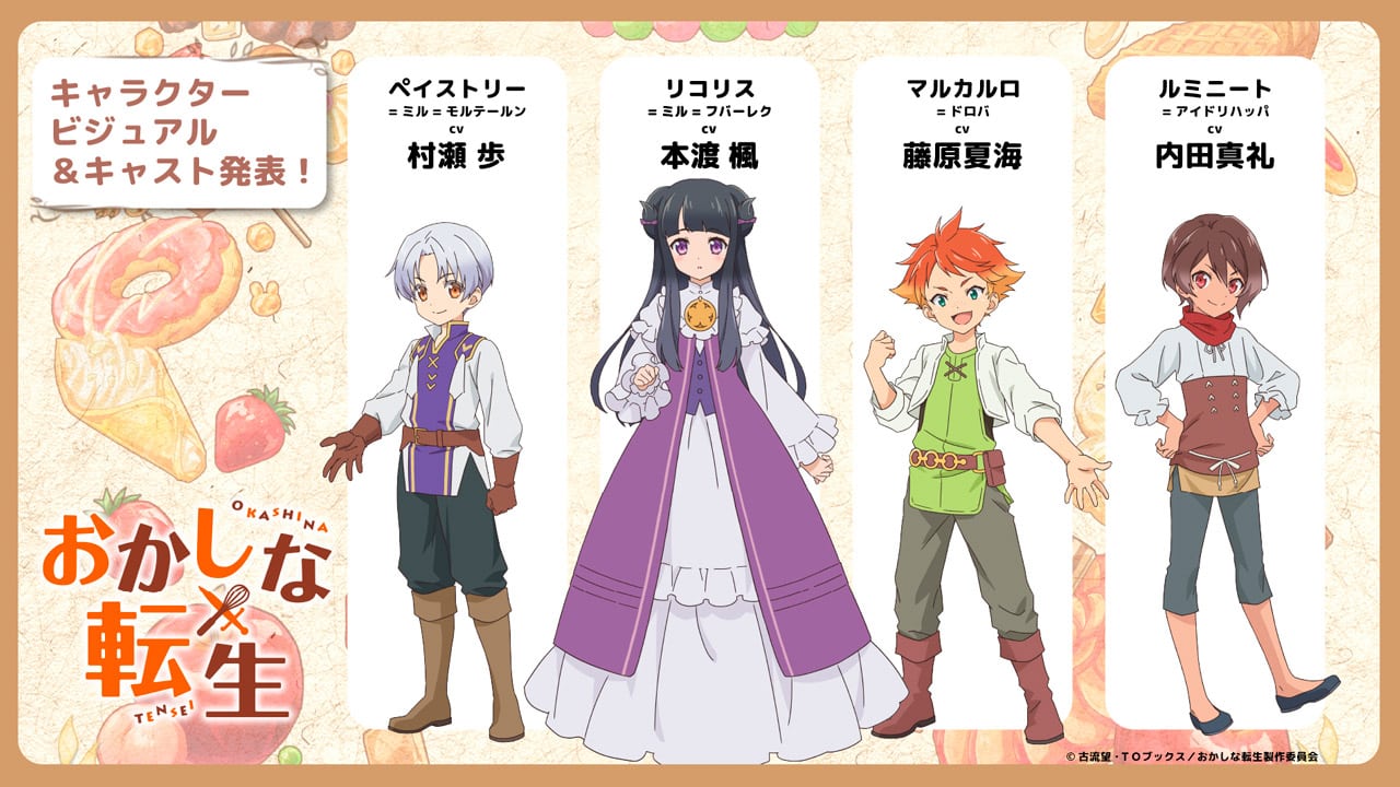 Adicionalmente, en los respectivos medios oficiales del anime Okashi na Tensei presentó a los primeros integrantes del elenco de voz, miembros del staff que participaran en la producción de la serie y su primera imagen visual.