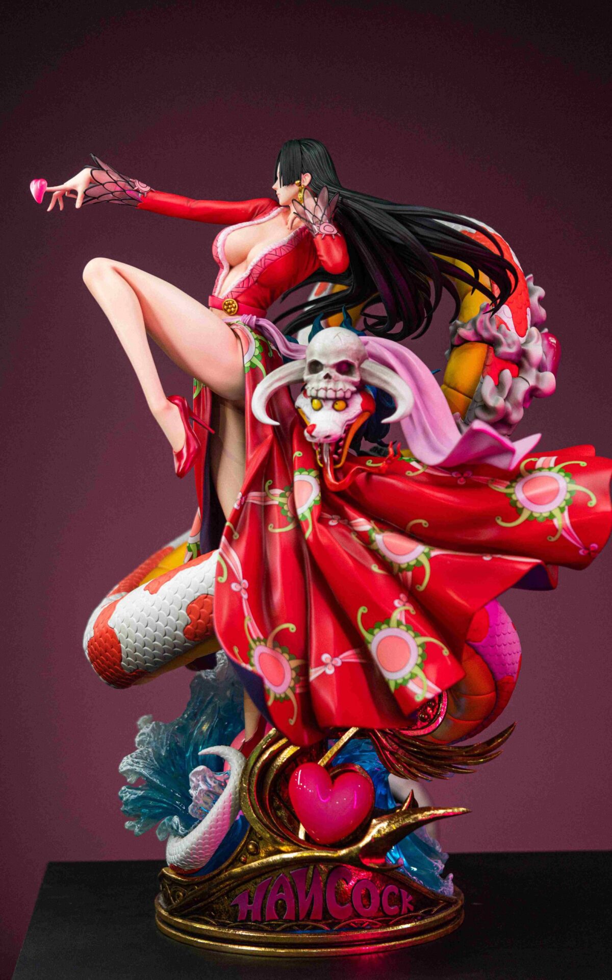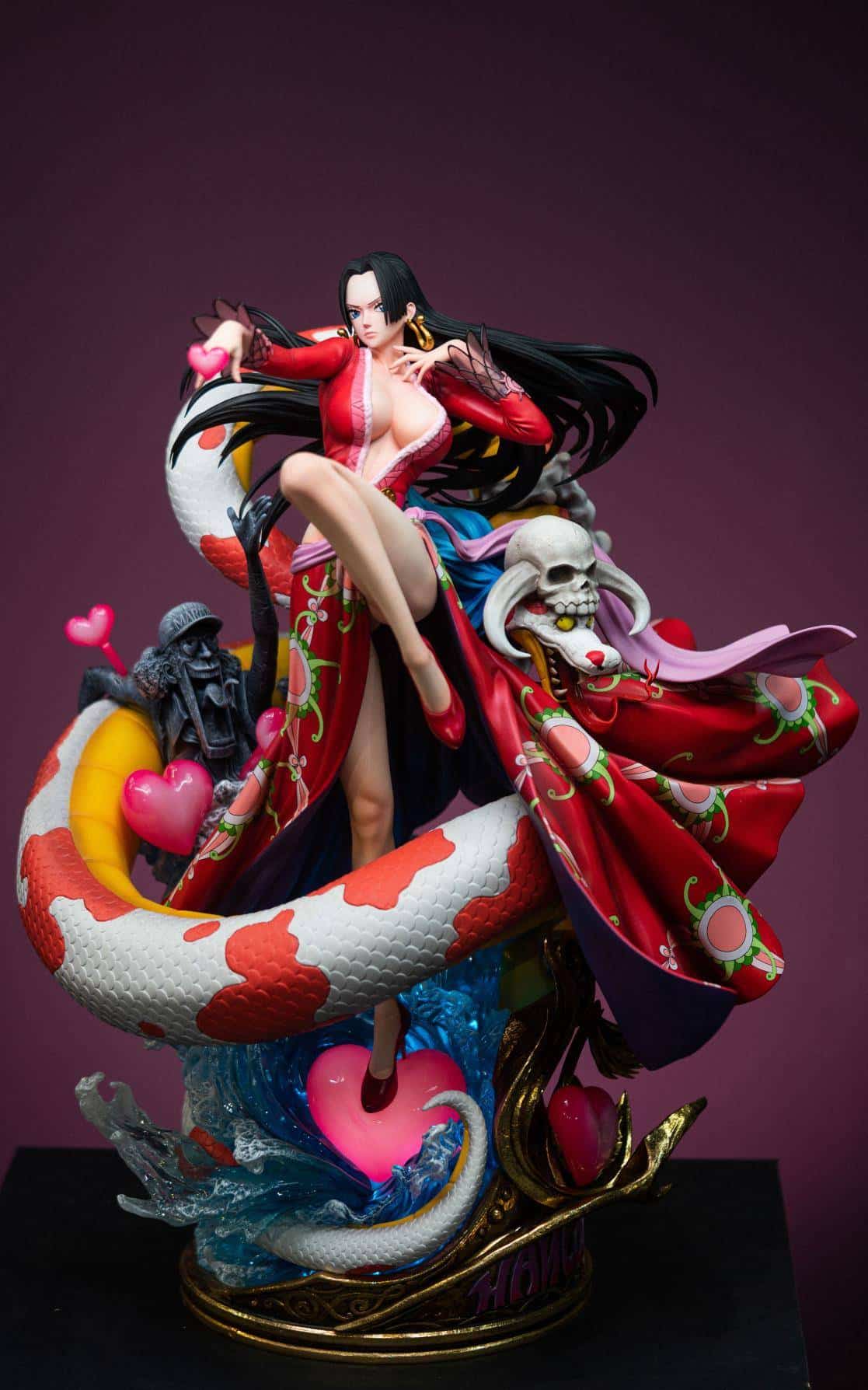 La compañía Jimei Palace Studio ha presentado una asombrosa y espectacular estatua coleccionable inspirada en la hermosa Boa Hancock, Emperatriz Pirata de Amazon Lily, capitana de las Piratas Kuja y ex-shichibukai de la marina. Donde podemos observar al personaje con una blusa reveladora de color rojo, exponiendo gran parte de su pecho como sus grandes atributos y un pareo que deja al descubierto sus piernas largas y delgadas con tacones rojos, acompañada `por su fiel serpiente Salome.
