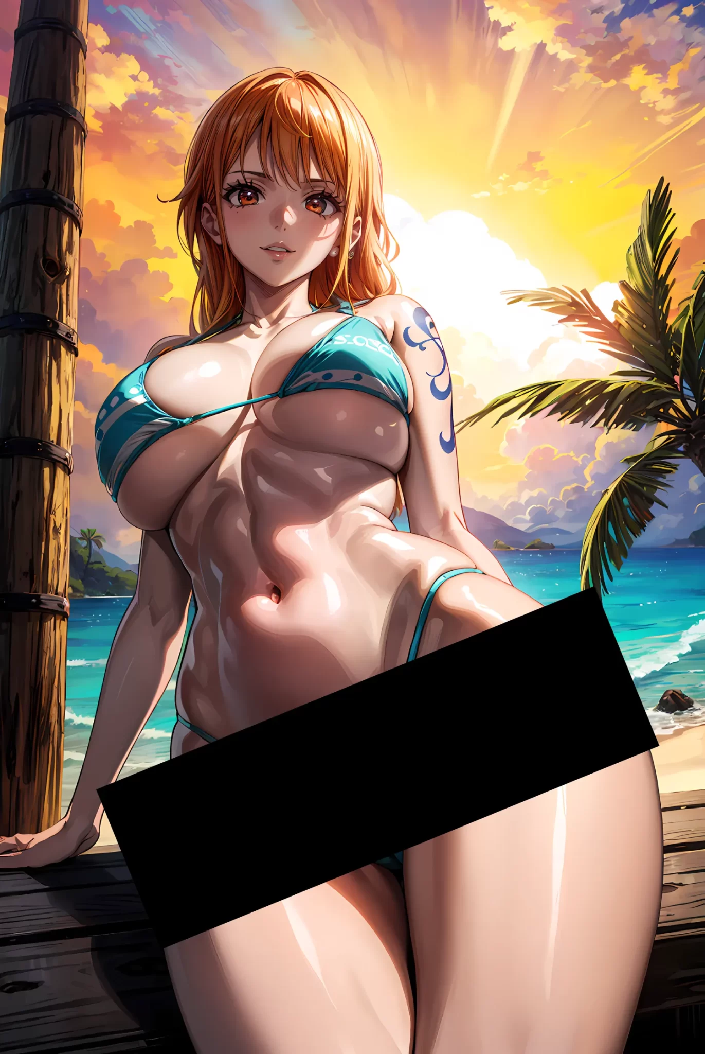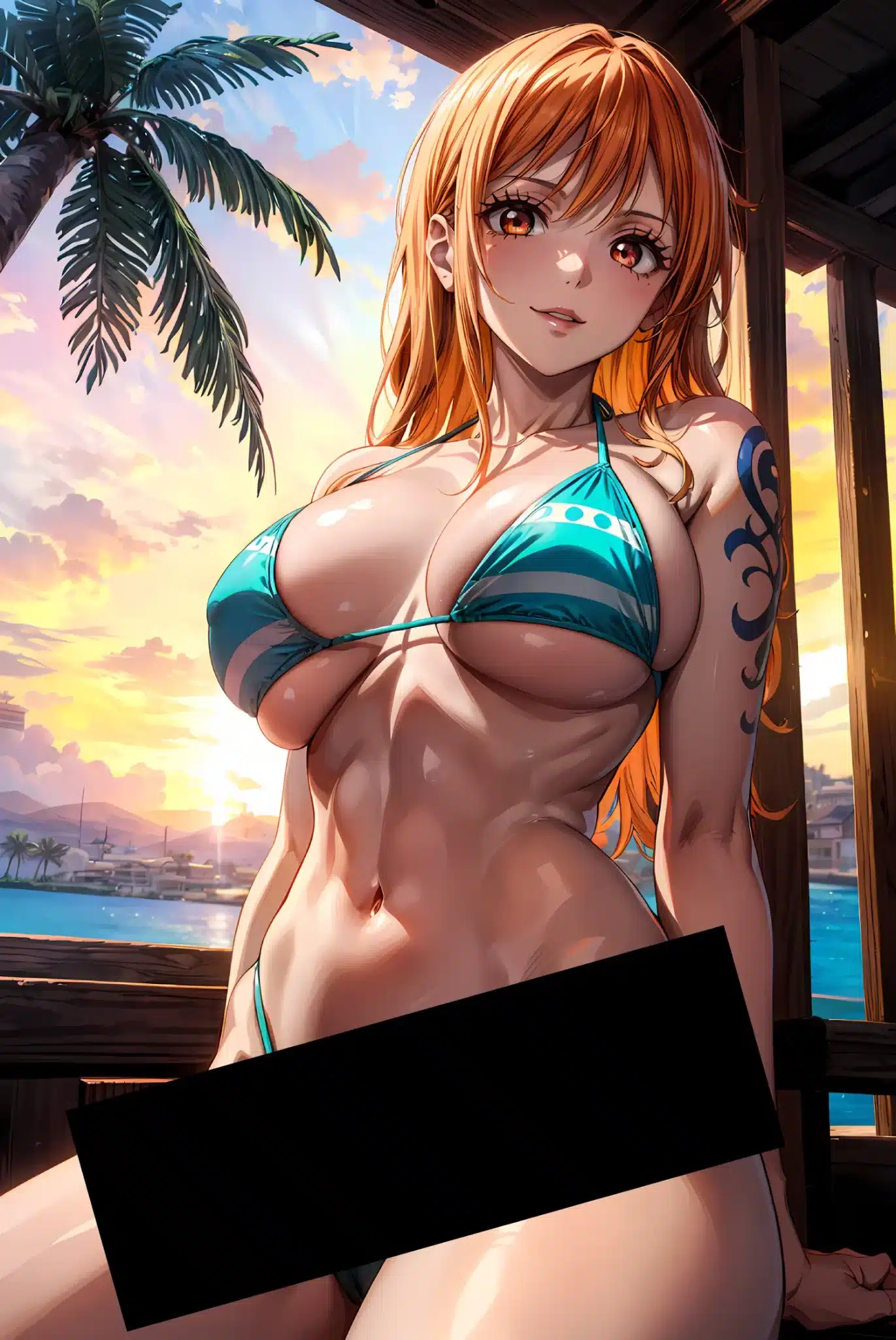 El diminuto traje de baño que envuelve a Nami en esta serie de ilustraciones no solo realza su figura, sino que también suscita una cautivación inmediata, y los matices minuciosos que perfilan el cuerpo de Nami, desde los delicados pliegues hasta los intrincados trazos y sombreados, despiertan una multitud de emociones a aquella persona que tiene la oportunidad de contemplar estas imágenes. Cada elemento converge en una experiencia visual que trasciende lo meramente estético, sumergiendo al espectador en una gran cantidad de sensaciones y admiración por el trabajo realizado por la Inteligencia Artificial.