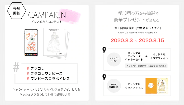 Mientras tanto, una campaña para colorear está en marcha con una versión de arte lineal del vestido de Nami. Los fanáticos pueden descargar el arte lineal, colorearlo y compartirlo en Twitter con los hashtags del concurso para tener la oportunidad de obtener premios.