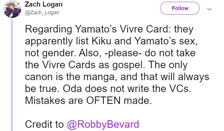 Con respecto a Vivre Card de Yamato: Aparentemente mencionan el sexo de Kiku y Yamato, no el género. Además, por favor, no tome las Vivre Cards como un evangelio. El único canon es el manga, y eso siempre será cierto. Oda no escribe los VC. A MENUDO se cometen errores.