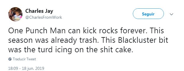El usuario @CharlesFromWork dijo en Twitter: «One Punch Man puede patear rocas para siempre. Esta temporada ya es basura. Esta parte de Blackluster es un pastel de mierda».