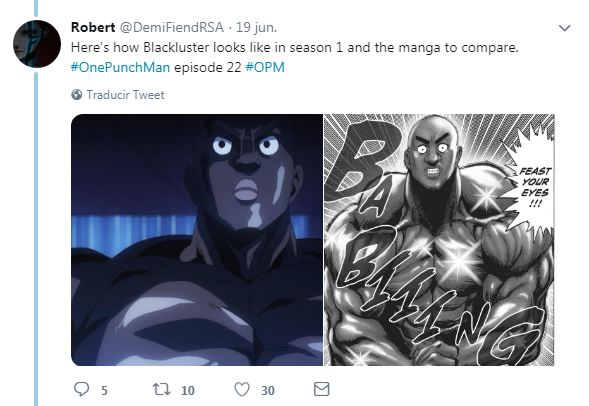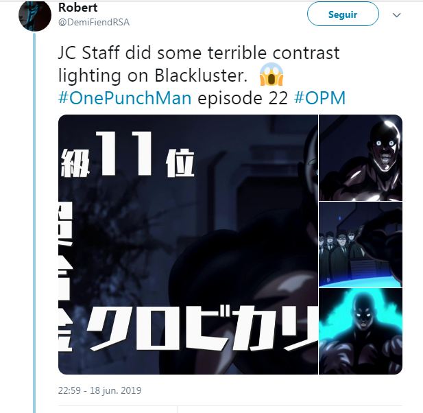 En un segun Tweet el dijo: «Así es como se ve Blackluster en la temporada 1 y en el manga para comparar. #OnePunchMan episodio 22 #OPM»