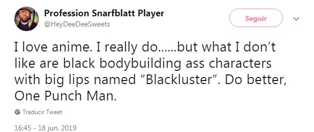 El usuario @HeyDeeDeeSweets dijo en Twitter: «Me encanta el anime. De verdad……pero lo que no me gusta son los personajes negros de culturismo culo con grandes labios llamado «Blackluster». Hazlo mejor, One Punch Man».