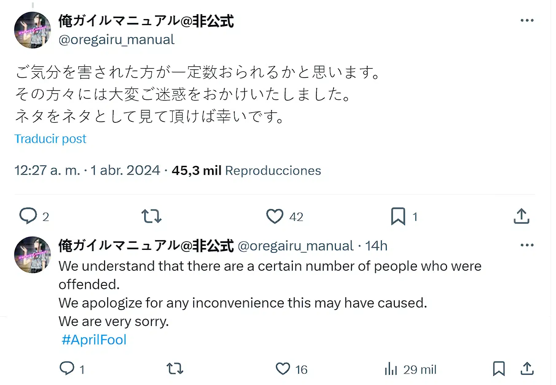 Lo más curioso de todo esto es que los fanáticos han «reaccionado» de una manera muy negativa ante esta broma por parte del comité de producción de la adaptación al anime de la novela ligera Oregairu, y es que en la publicación original realizada en la cuenta de Twitter/X oficial, muchas personas se han mostrado molestas por esta broma realizada, por lo que se realizó otra publicación tanto en Japonés como en Inglés para pedir disculpas por aquellas personas que se han sentido «ofendidas» por esta broma.