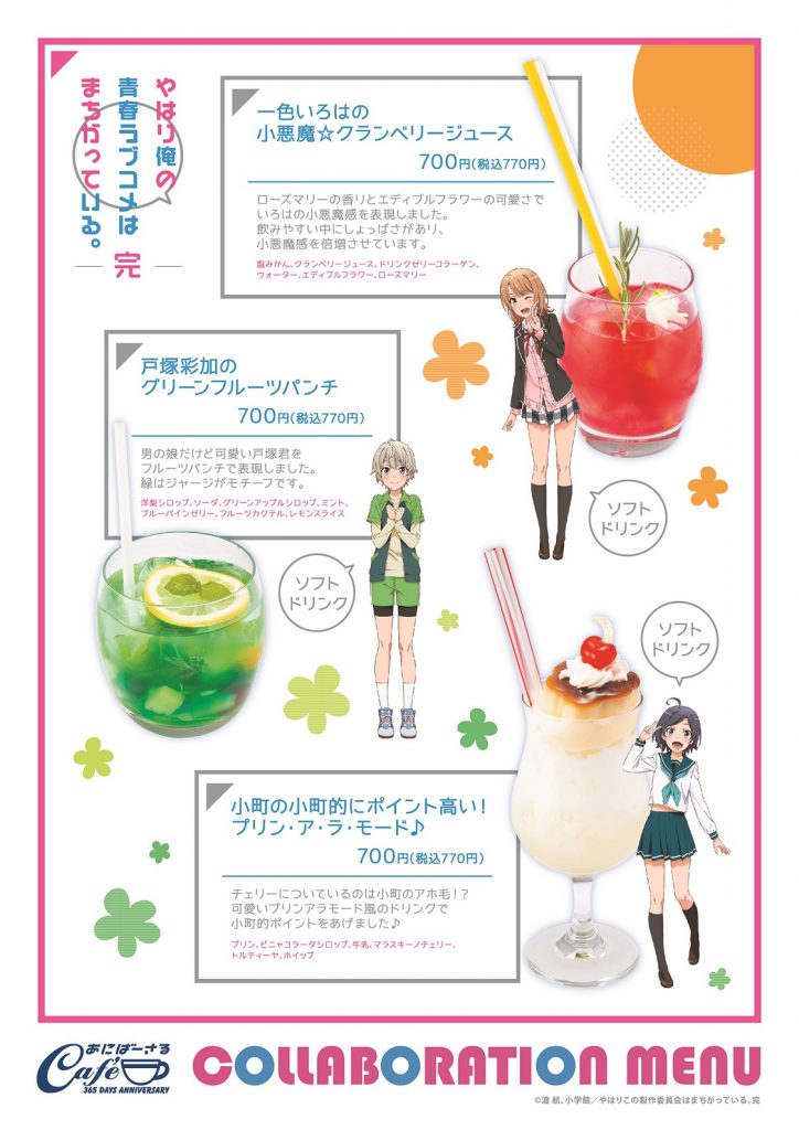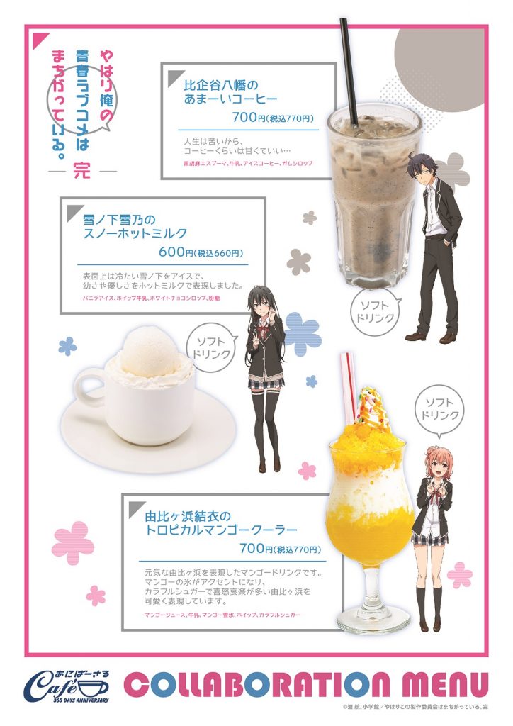 Para celebrar el final de la novela ligera y el anuncio de la tercera temporada, la franquicia Yahari Ore no Seishun Love Comedy wa Machigatteiru (Oregairu) anunció una colaboración con una cafetería para anunciar un menú inspirado en los protagonistas.
