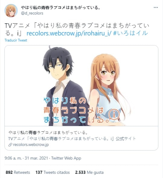 El dia de hoy 1 de abril (En japón) se anunció la producción de una nueva temporada del anime Yahari Ore no Seishun Love Come wa Machigatteiru (Oregairu). El anuncio fue publicado por la cuenta oficial en Twitter del anime y vino acompañado de una nueva imagen promocional protagonizada por los personajes Hachiman Hikigaya y Iroha Isshiki.