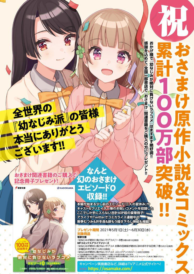 A través de una imagen promocional, se reporto que la franquicia literaria Osananajimi ga Zettai ni Makenai Love Comedy (The Romcom Where The Childhood Friend Won’t Lose!) ha logrado alcanzar la cifra del millón de copias en circulación. Cabe mencionar que esta cifra corresponde a las copias de los volúmenes en circulación tanto como la novela ligera como sus respectivas adaptaciones y spin-off.