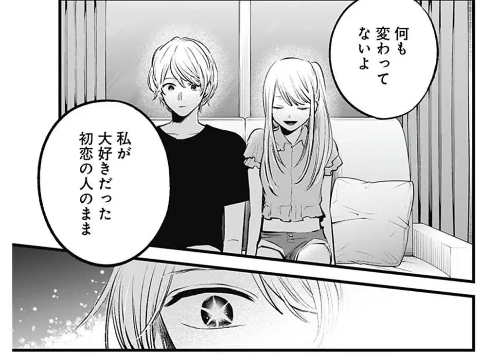 En el capítulo pasado, Ruby le propone a Aqua que practiquen le beso que se darán en el filme, a lo que el responde negativamente comentándole que no es correcto debido a varias decisiones que ha tomado en esta nueva vida. Es aquí donde vemos como Ruby le dice que al «sensei» que siempre lo ha admirado y lo ha querido, que le guarda un aprecio muy grande por todo lo que hizo por ella y no importa lo que esté pasando para ella, él será «su estrella». Acto seguido ella lo besa y un panel de transición también se nos muestra la icónica escena del beso entre «Ai» y «Kamiki».