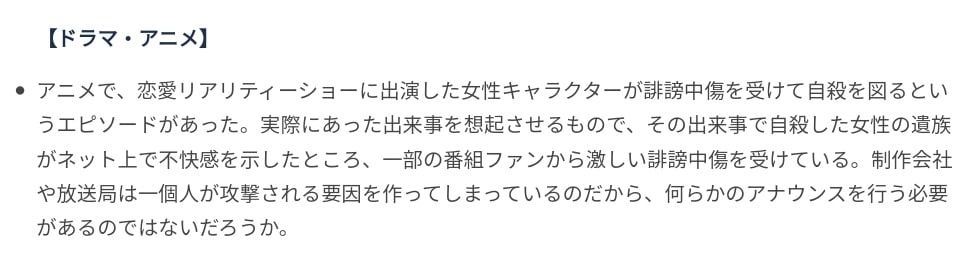 En una publicación el BPO comento lo siguiente: «En un anime(Oshi no Ko), hubo un episodio en el que un personaje femenino en un reality show de citas recibe acoso y contempla el suicidio. Debido a que la representación evoca un verdadero En el incidente de la vida, los familiares de la mujer que se suicidó expresaron su incomodidad en línea y han estado recibiendo un acoso excesivo de parte de un subconjunto de los fanáticos del programa.»