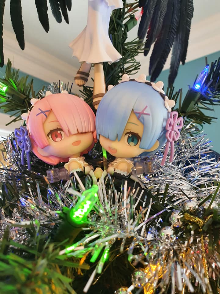 En la parte de arriba del pino podemos ver como Albedo sustituye la estrella y debajo de ella están dos figuras chibi de Ram y Rem.