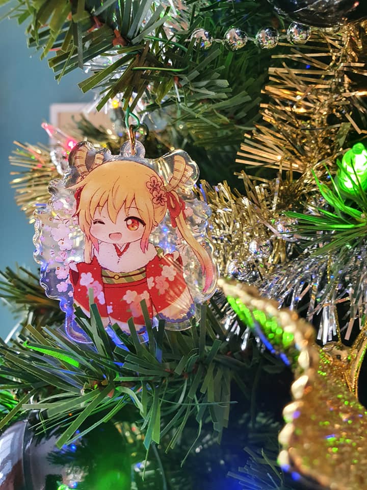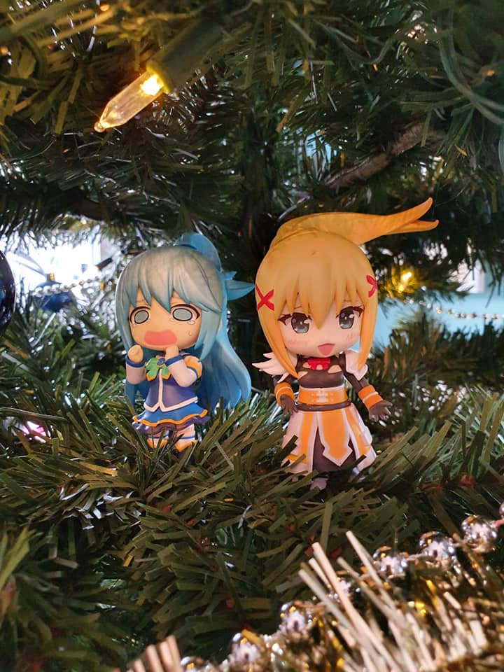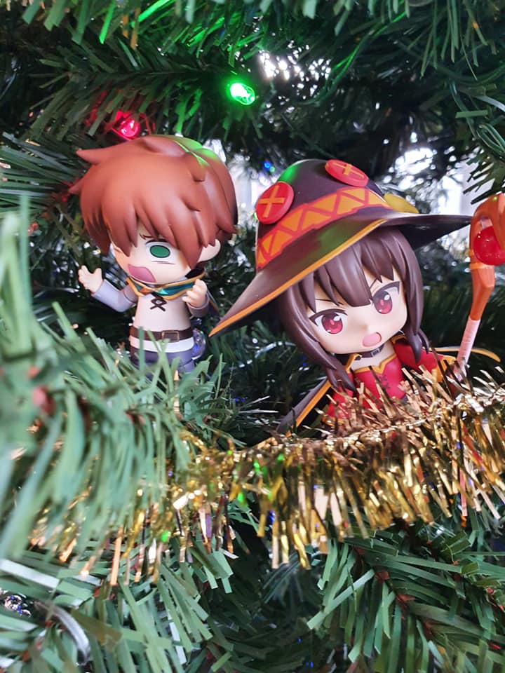 A lo extenso del árbol de navidad, podemos ver una amplia variedad de figuras nendoroid de franquicias tan queridas como Konosuba, además también hay llaveros de acrilico y goma colocados como si fueran esferas.