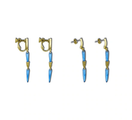 Los aretes con tonos azules y dorados recrean a la perfecciรณn los que usa Catarina Claes y estรกn hechos de vidrio y latรณn.