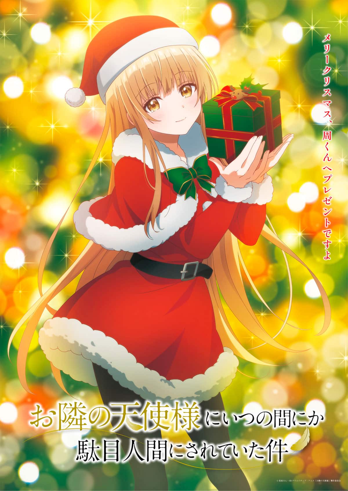 En los medios oficiales para la adaptación al anime basado en la novela ligera de comedia romántica «Otonari no Tenshi-sama ni Itsunomanika Dame Ningen ni Sareteita Ken» (The Angel Next Door Spoils Me Rotten) se ha brindado nuevas actualizaciones al público sobre la serie y con el objetivo de celebrar la próxima llegada de la navidad, se compartió una imagen visual especial que es protagonizada por la protagonista femenina «Mahiru Shiina«, quien para la ocasión ha sido vestida con un hermoso traje navideño.