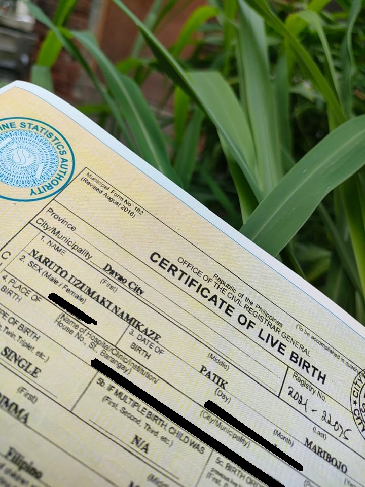 Pero no conforme con llamarlo Naruto, Jamesey Bolivar incluyó los apellidos del personaje en el nombre de su hijo, de modo que su nombre completo es Naruto Uzumaki Namikaze P. Maribojo como se puede apreciar en su acta de nacimiento.