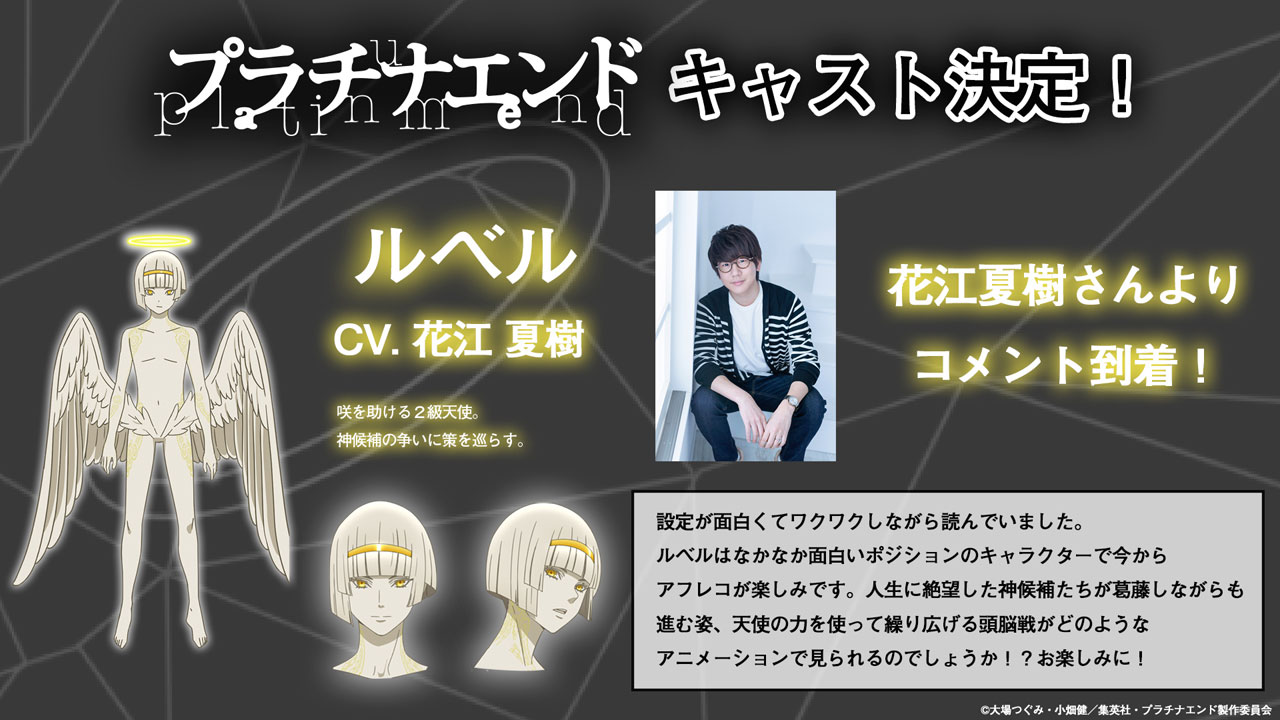 A través del sitio web oficial para la adaptación a anime del manga Platinum End, se ha revelado a nuevos miembros del elenco de voz y diseños de personajes para la serie. Cabe recordar que el anime esta programado para estrenarse en este año.