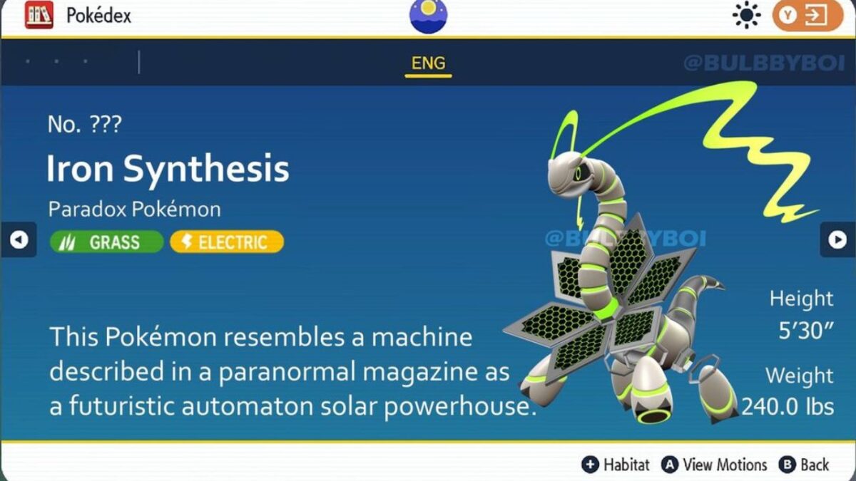 Iron Synthesis (Sintesis de Acero): Una forma futura de Meganium que representa el concepto de la energía solar y como los paneles que la recolectan tienen forma de flor. Apropiadamente, este Fakemon es de Tipos Planta/Eléctrico. Una crítica común entre los fanáticos fue que las Formas Paradójicas futuras son demasiado simples, ya que todas parecen simples versiones robóticas de Pokémon existentes. Así que es satisfactorio ver una que utiliza una idea interesante y que tiene sentido como la versión futura de Meganium.