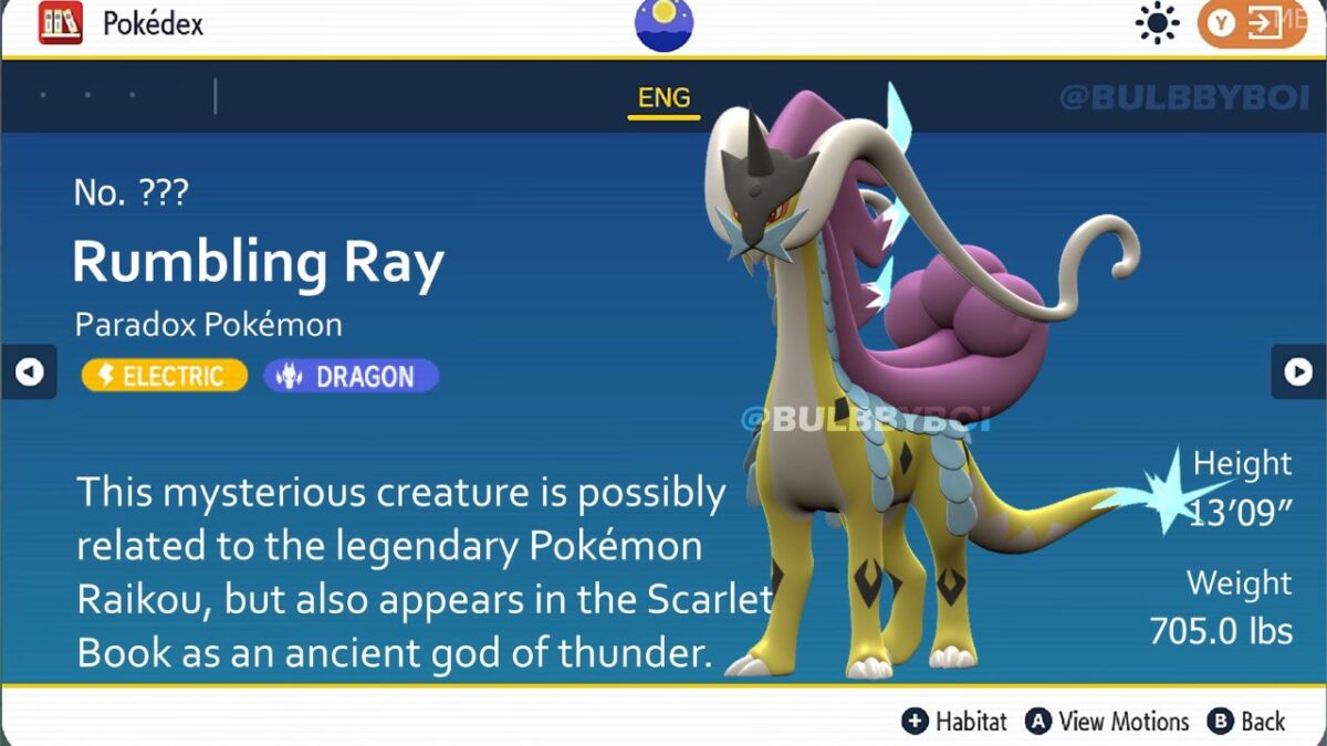 Rumbling Ray (Rayo Retumbante) y Feral Flare (Bengala Salvaje): Formas pasadas de Raikou y Entei respectivamente que les añade el Tipo Dragón secundario a las bestias legendarias. Hace unos meses, Pokémon anunció a la Forma Paradoja oficial de Suicune, llamada Walking Wake (Ondulagua en español) la cual convierte al Pokémon mamífero en un dinosaurio y le agrega el Tipo Dragón. Así que los artistas de Fakemon se pusieron a especular como se verían las formas pasadas de Raikou y Entei que obviamente vamos a recibir en los próximos meses. Estas dos versiones de bulbbyboi se ven excelentes, y casi parece que está filtrando material oficial.