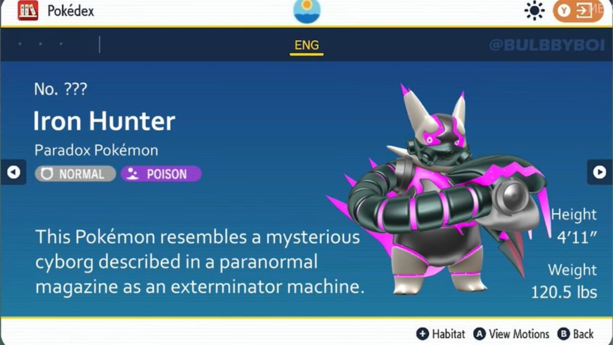 Iron Hunter (Cazador de Acero): una forma futura de Zangoose de Tipos Normal/Veneno que lo convierte en un cyborg que se ha combinado con Seviper, el Pokémon serpiente y el eterno rival de Zangoose. No solo es un épico diseño, sino que la idea de combinar a estas dos criaturas es ingeniosa, y nos recuerda a la Forma Paradójica existente: Iron Valiant.
