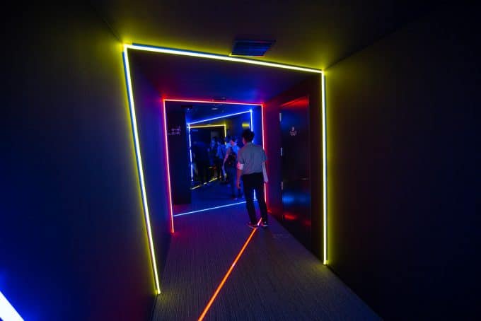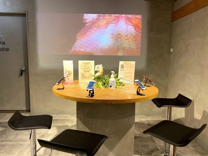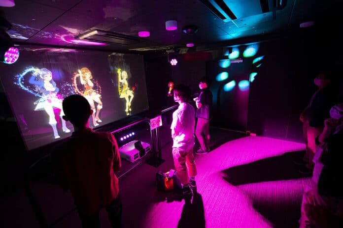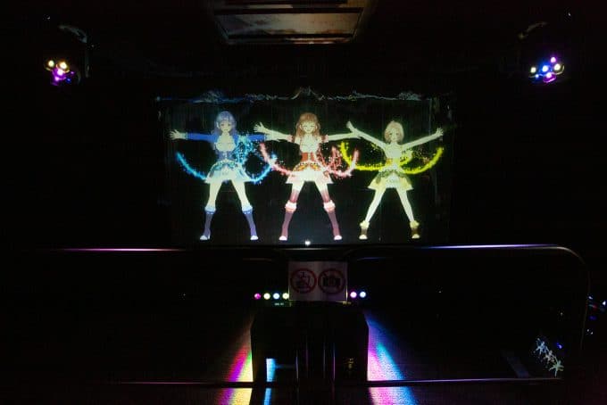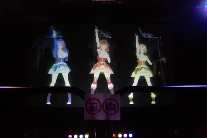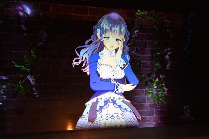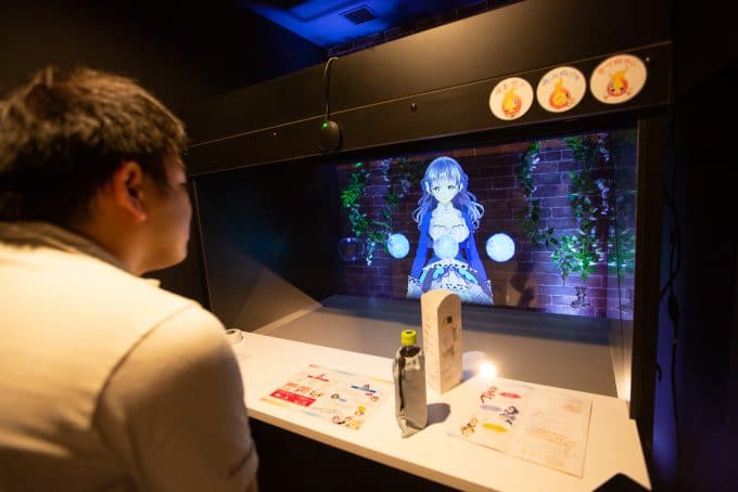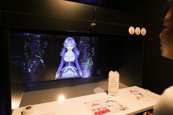 El dispositivo en el que aparece la diosa en una habitación privada a veces se describe coloquialmente como un «holograma», pero para ser precisos, es El Fantasma de Pepper. Una tecnología antigua que utiliza paneles reflectantes colocados en un ángulo, y se usó en el teatro DMM VR en Yokohama, que cerró en abril de este año. Experimenté este sistema en Prhythm ☆ StellA, que ha sido utilizado en muchos otros parques temáticos. Sin duda la calidad de la imagen era bastante buena.