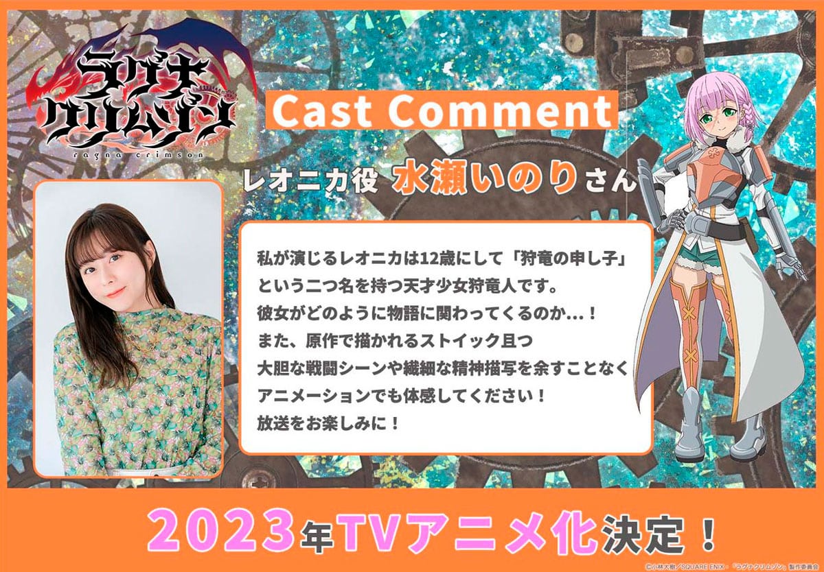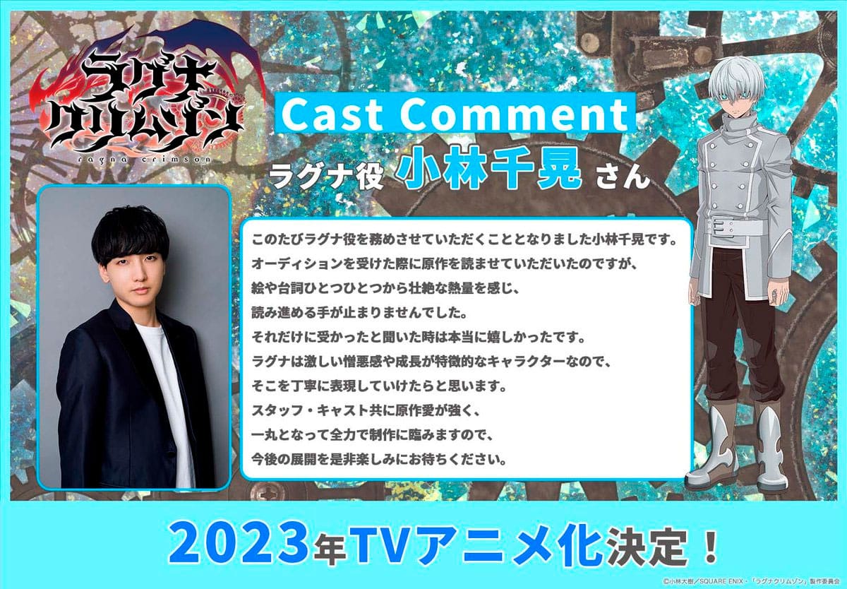 De manera adicional, en el sitio web oficial para la adaptación al anime del manga Ragna Crimson presentó a los primeros integrantes del elenco de voz, miembros principales del staff que participara en la producción de la serie y una nueva imagen visual protagonizada por los personajes Ragna y Crimson.