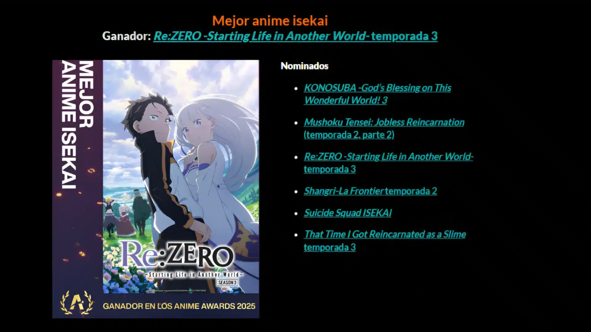 Crunchyroll dio inicio a una nueva ediciรณn de los Crunchyroll Anime Awards 2025. Hace unos instantes, anunciรณ al ganador de la categorรญa ยซMejor Anime Isekaiยป: Re: Zero โ Starting Life in Another World (Temporada 3). Es una serie que continรบa cautivando a los fans, quienes esperan por el estreno de su cuarta temporada.