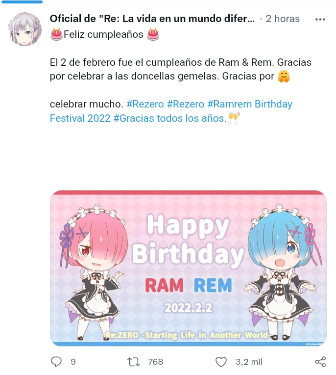 Seguramente muchos de los que estan leyendo esta noticia sabrán que hoy 2 de febrero se celebra el cumpleaños de tal ves las gemelas más conocidas de todos los animes, por supuesto hablamos de Ram y Rem de la franquicia de Re: Zero y como es de costumbre la cuenta oficial de Twitter de Re: Zero publicó una imagen en celebración del cumpleaños de las gemelas.