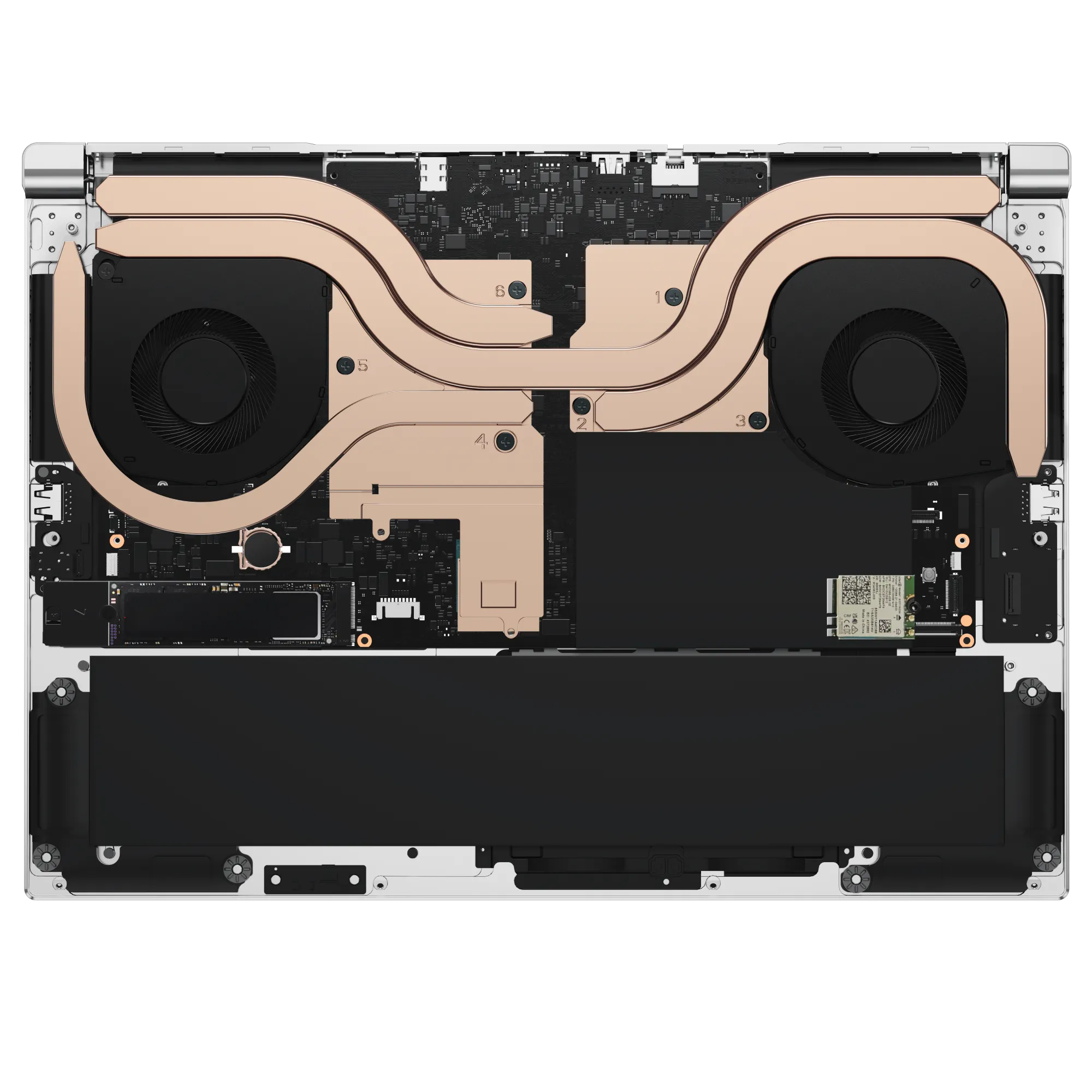 REDMAGIC ha ido más allá para asegurar que el Titan 16 Pro se mantenga fresco incluso durante las sesiones de juego más intensas. El portátil cuenta con un sofisticado sistema de refrigeración con tres ventiladores y siete tubos de calor, incluyendo un diseño único de metal líquido. Los ventiladores turbo duales operan a una impresionante velocidad de 4500 RPM, entregando un volumen de aire de 13.8 CFM y una presión de viento de 15.2 mmAq. Esta avanzada solución de refrigeración gestiona eficazmente el calor, permitiendo un rendimiento consistente sin throttling térmico.