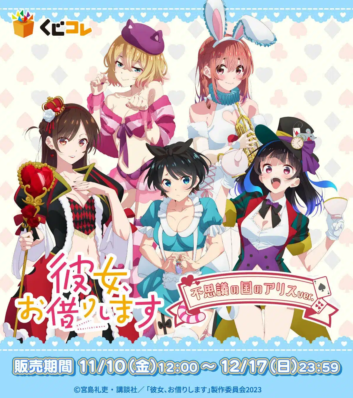 En los medios oficiales de la compañía Kujikore se ha dado a conocer al público una interesante colaboración con el popular anime de comedia romántica Kanojo, Okarishimasu (Rent-a-Girlfriend). Este evento especial tendrá una curiosa temática, y es que los personajes Chizuru Mizuhara, Mami Nanami, Ruka Sarashina, Sumi Sakurasawa y Mini Yaemori (una nueva waifu presentada en la tercera temporada de la serie) serán vestidas con atuendos que hacen referencia a la obra literaria «Alicia en el País de las Maravillas«.