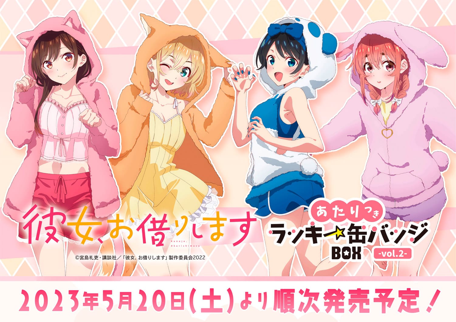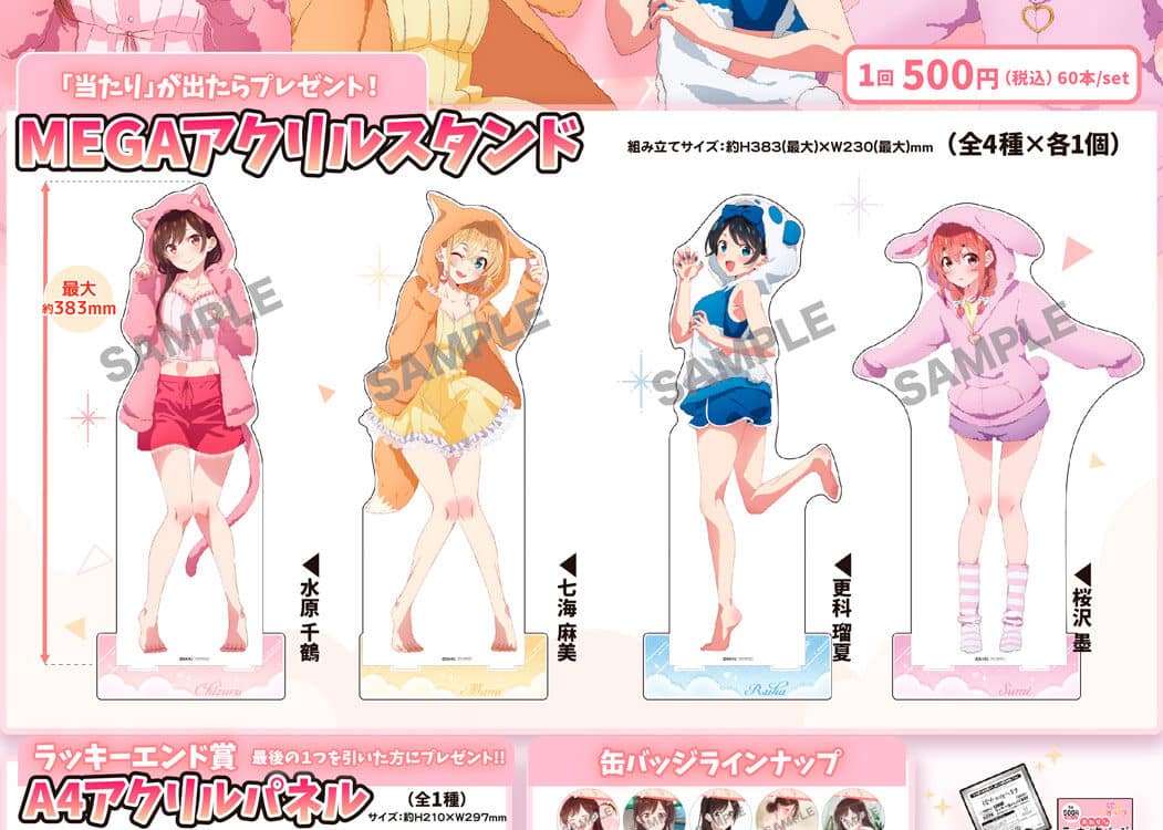 En esas ilustraciones, podremos ver cómo Chizuru Mizuhara luce un cómodo atuendo de gato de color rosa oscuro, Mami Nanami luce un atuendo de zorro de color marrón, Ruka Sarashina viste un atuendo de panda con tonalidades azules y blancas, y Sumi Sakurasawa luce un adorable atuendo de conejita de color rosa.