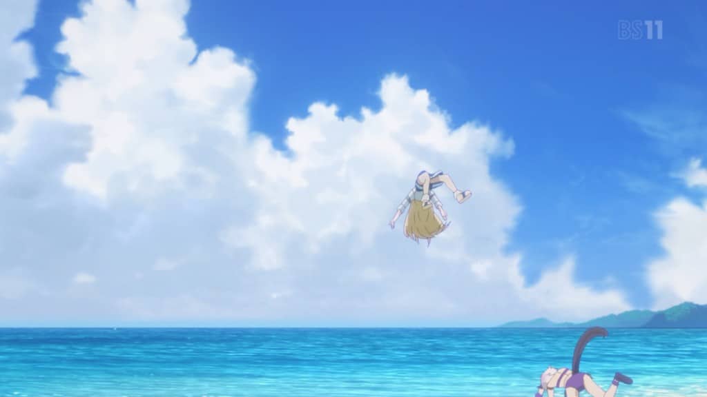Cambio de escena y vemos que el gremio finalmente llega al destino de su viaje, rápidamente los aventureros se adentran al mar para jugar excepto Kyaru, que al ser un gato y estar muy metida en su alma felina, le aterra el mínimo contacto al agua. Después de jugar un rato el hambriento grupo s e detiene un momento a descansar para que se nos revele que toda la fuerza proveniente de Pecorine viene de su armadura y el porqué de su gigante apetito