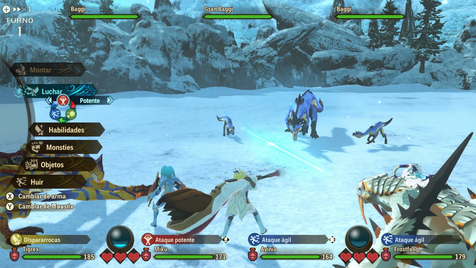 Es importante saber que no todos los monstruos usarán los mismos movimientos, algunos que son más escurridizos. Por ejemplo tendremos que usar armas ligeras y otros que están completamente blindados tendremos que usar armas mucho más potentes, a esto también tendremos que sumar las habilidades especiales y nuestro ataque conjunto el cual podremos hacer una vez carguemos la barra inferior. Además también de cambiar de monstie en batalla si este no es eficaz contra el monstro que estemos luchando.