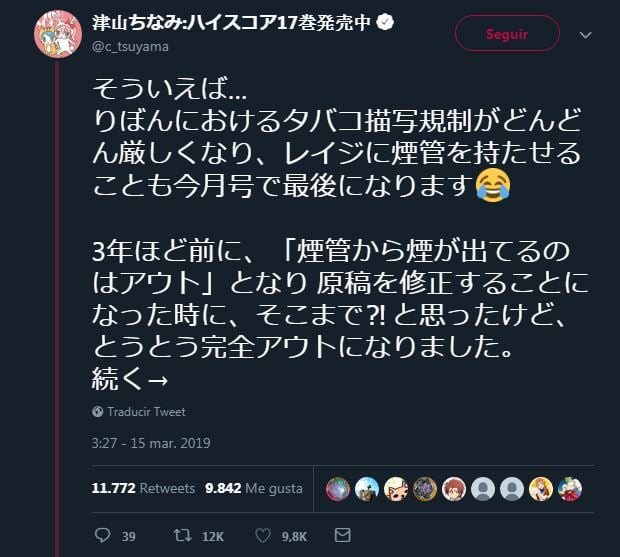 La mangaka Chinami Tsuyama (High Score) reveló en Twitter que no habrá más escenas en su manga donde aparezcan personajes fumando o con cigarrillos, por restricciones impuestas por la revista Ribon. En el mismo tweet, ella también mencionó que hace tres años le advirtieron que no podría dibujar cigarrillos que emitieran humo, y aún así ella se sorprendió con cuán apretadas eran las restricciones.