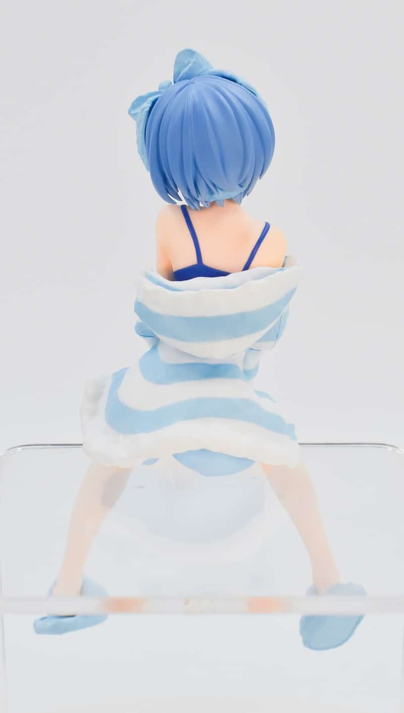 La figura nos presenta a Rem utilizando una cómoda vestimenta hogareña, con un sweater y unas pantuflas azules. Está hecha de plástico PVC de alta calidad, así como un stand de acrílico transparente. Además, la figura presenta una pose y una cara alegre, lo cual hace que desprenda mucha ternura.