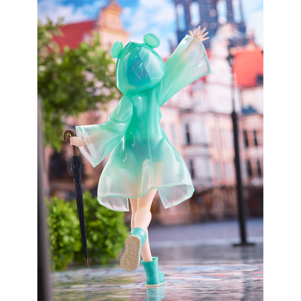 Esta figura nos presenta al personaje Rem portando un adorable impermeable azul con orejitas, con una hermosa expresión que refleja la personalidad alegre del personaje. Alzando la mano derecha para saludar a alguien, mientras que sostiene un paraguas con la mano izquierda, dando la impresión de estar caminando. No cabe duda que esta figura describe a la perfección al personaje.