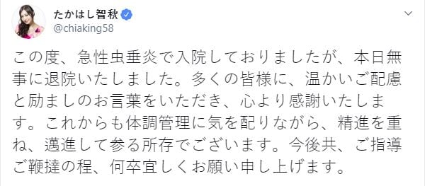 La actriz de voz Chiaki Takahashi revelรณ en su cuenta de Twitter que el lunes que fue dada de alta del hospital, despuรฉs de que fuera hospitalizada por una apendicitis aguda.