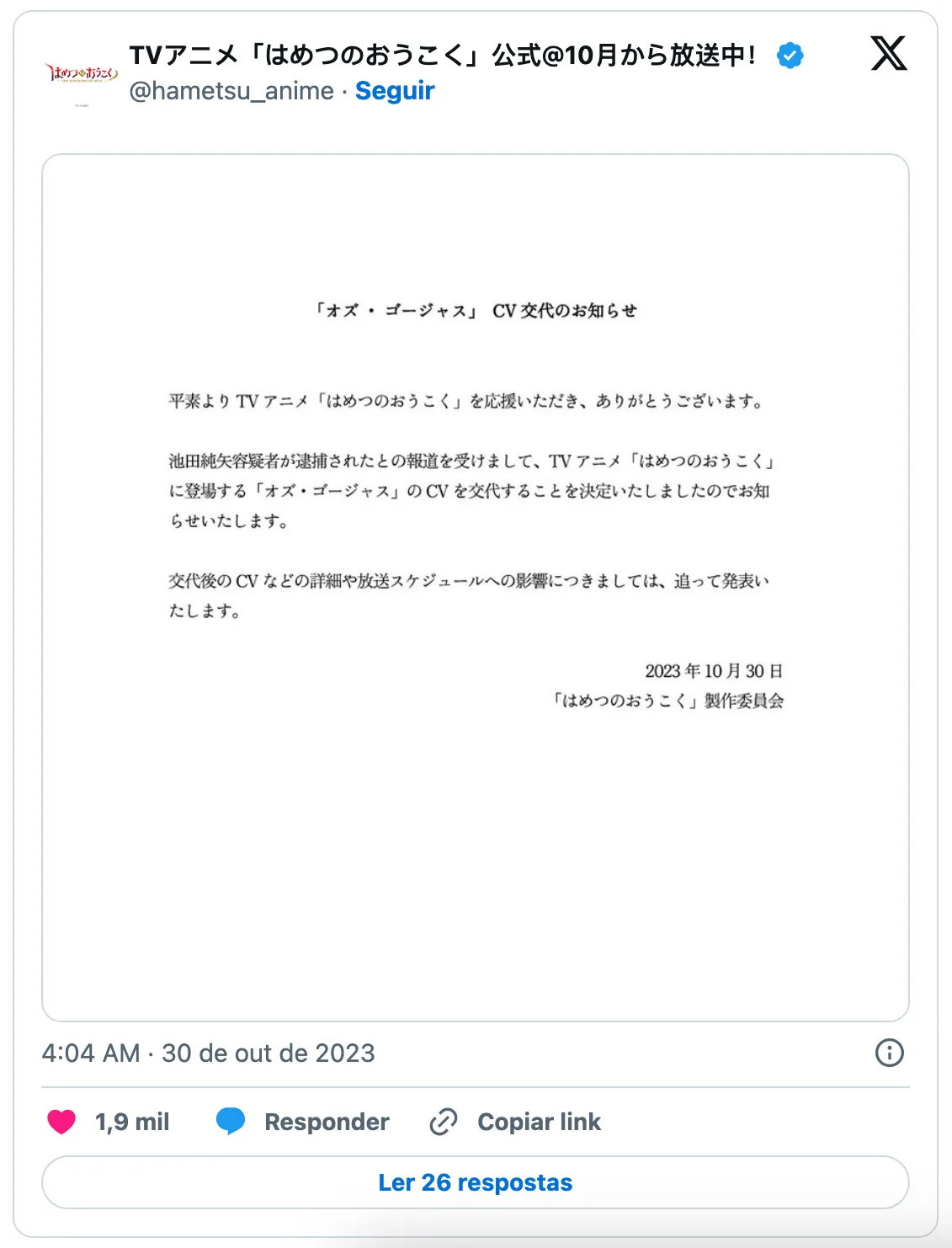 Esta tarde la cuenta oficial del anime de temporada otoño 2023 titulado «Hametsu no Oukoku» (The Kingdoms of Ruin), ha lanzado un comunicado a través de su cuenta oficial en X antes Twitter, informado que el seiyuu Junya Ikeda que se encontraba trabajado en el proyecto dándole voz al personaje secundario «Oz Georgous» quien recién en el último capítulo había hecho su primera aparición, será remplazado debido al reciente arresto de Ikeda por parte de la policía por su participación en un fraude.