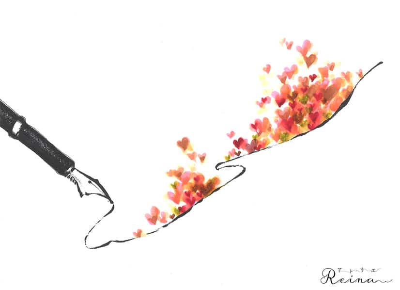 La segunda titulada «carta de amor«, Reina Ueda nos muestra una pluma dejando a su paso la tinta y como esta desprende unos corazones en tonos rojos, en una paleta que contrasta el blanco y negro, en alusión a una vida aburrida sin el amor y con tonos alegres a color de los corazones que representan alegría y el cambio de llegada de este sentimiento a la vida.