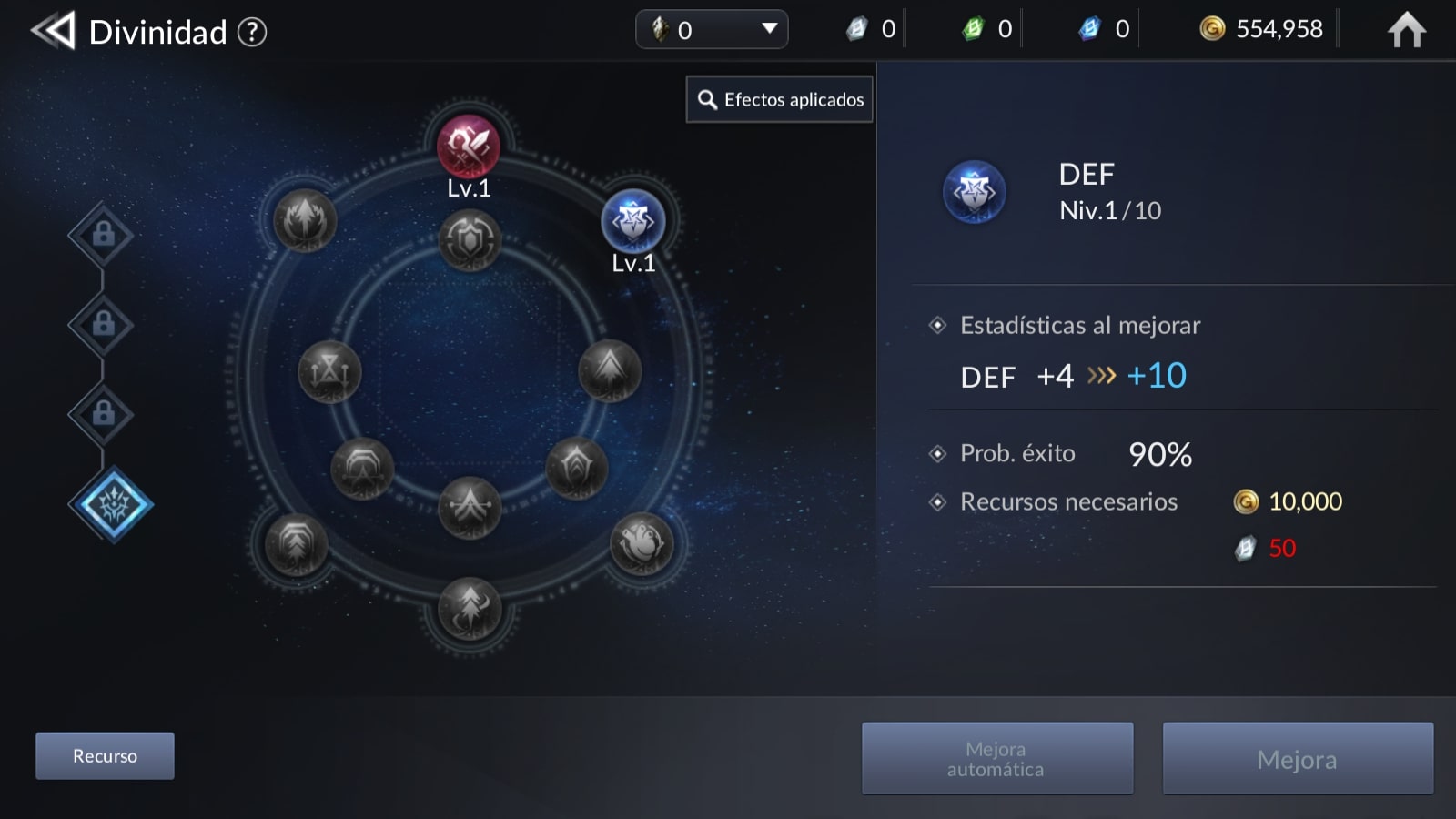 Después de desbloquear la Maestría, obtendremos la sección de divinidad. Un apartado en el que podremos obtener bonificaciones para nuestros personajes al canjear runas y oro.