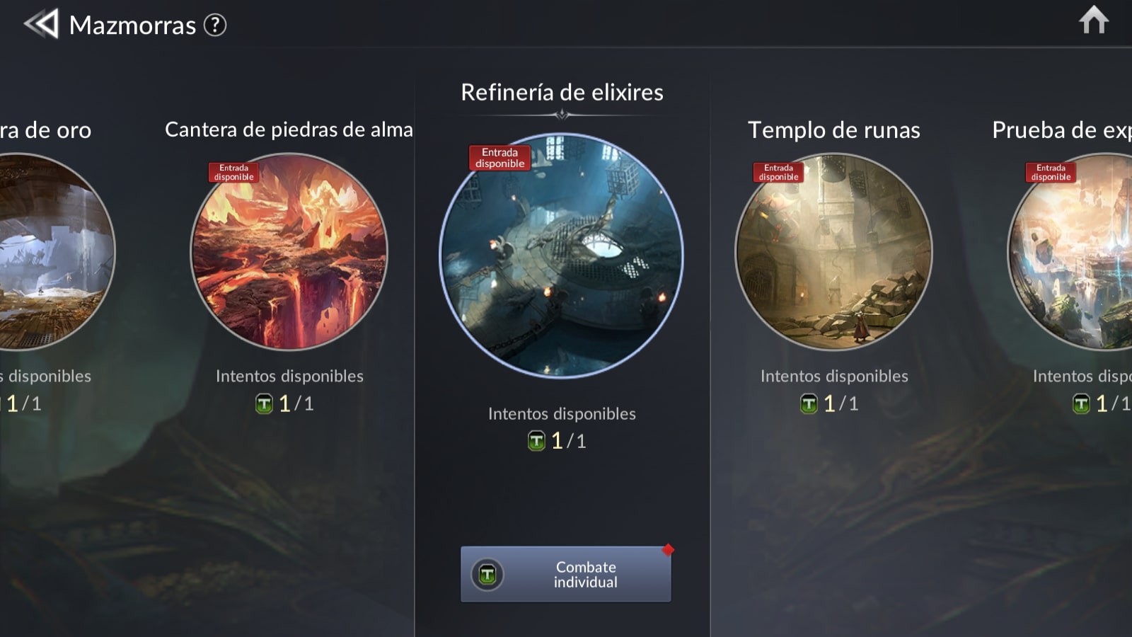 Para conseguir algún tipo de recompensa en especifico podremos completar las mazmorras, zonas donde tendremos la oportunidad de conseguir runas, experiencias, oro, elixires y experiencia. Teniendo cada día un intento para completar cada una de las 5 mazmorras.