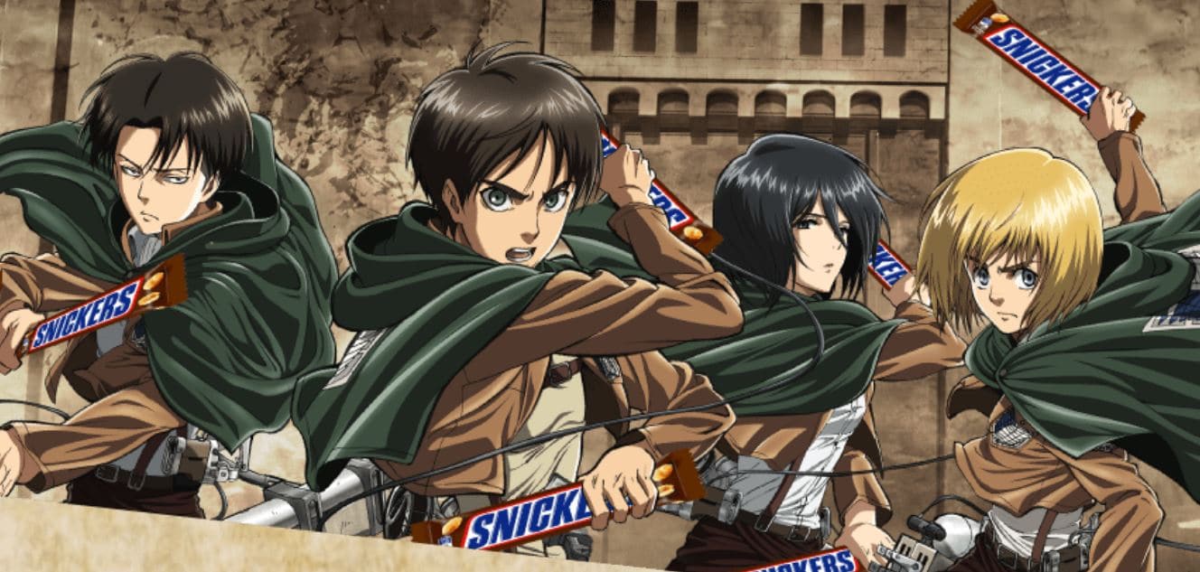 Una cuenta oficial en Twitter de Shingeki no Kyojin reveló una colaboración con la marca de chocolates Snickers donde los fans podrán ganar increíbles Snickers gigantes con un diseño limitado.