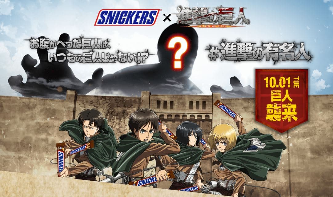 Como previamente les comentamos, recientemente la franquicia Shingeki no Kyojin anunciรณ una colaboraciรณn con la marca de chocolates Snickers. Razรณn por la que se estrenรณ anuncio para conmemorar la colaboraciรณn.