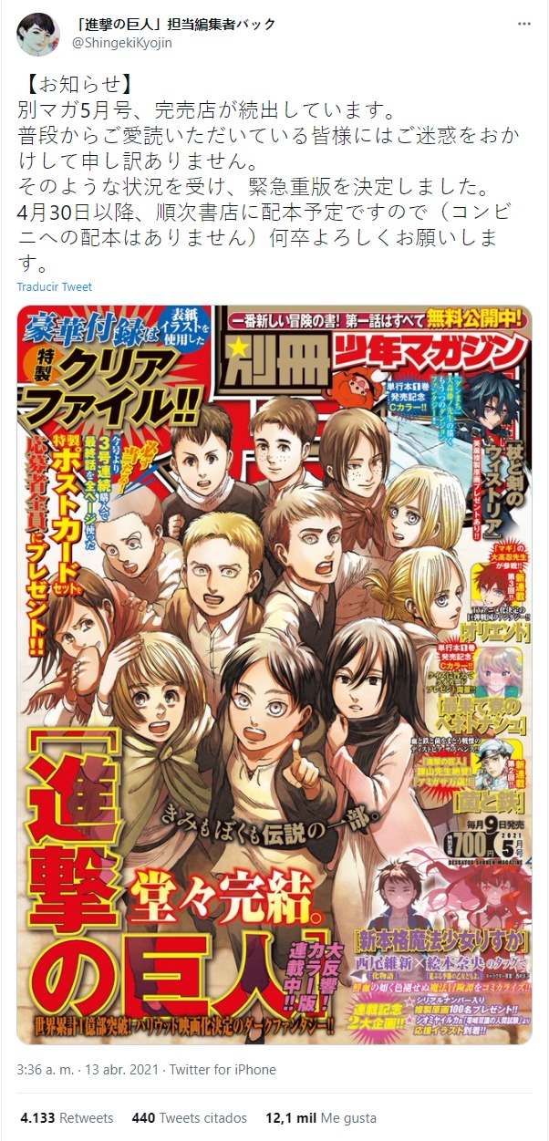 La última edición de la revista Bessatsu Shonen Magazine correspondiente al mes de mayo y lanzada el pasado 9 de abril del 2021, será reimpresa de «emergencia». Esto luego de que el editor del manga Shingeki no Kyojin informará mediante su cuenta de Twitter sobre el problema de abastecimiento en las tiendas.